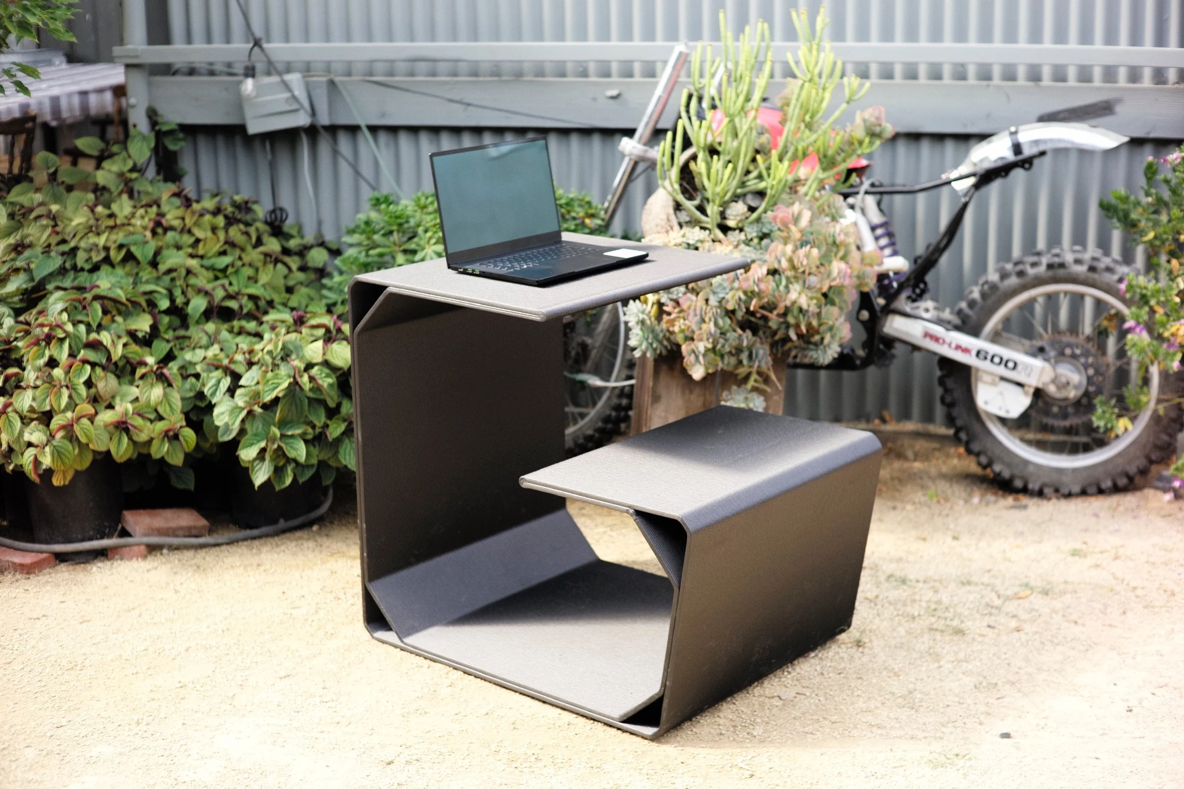 Prompt: “A long contemporary Walnut slab desktop that is balanced and cantilevered over a squashed, egg shaped, smooth boulder.”